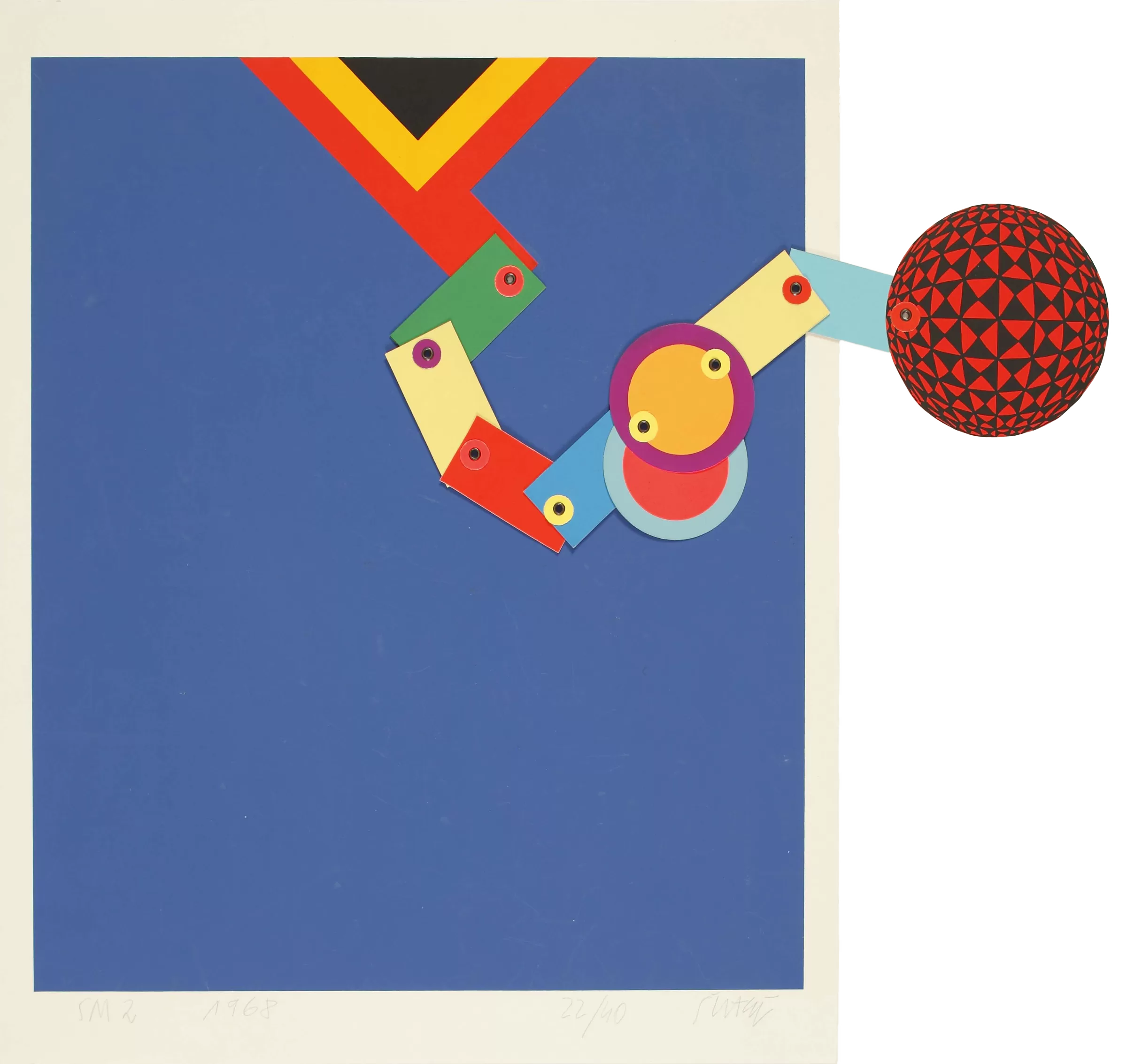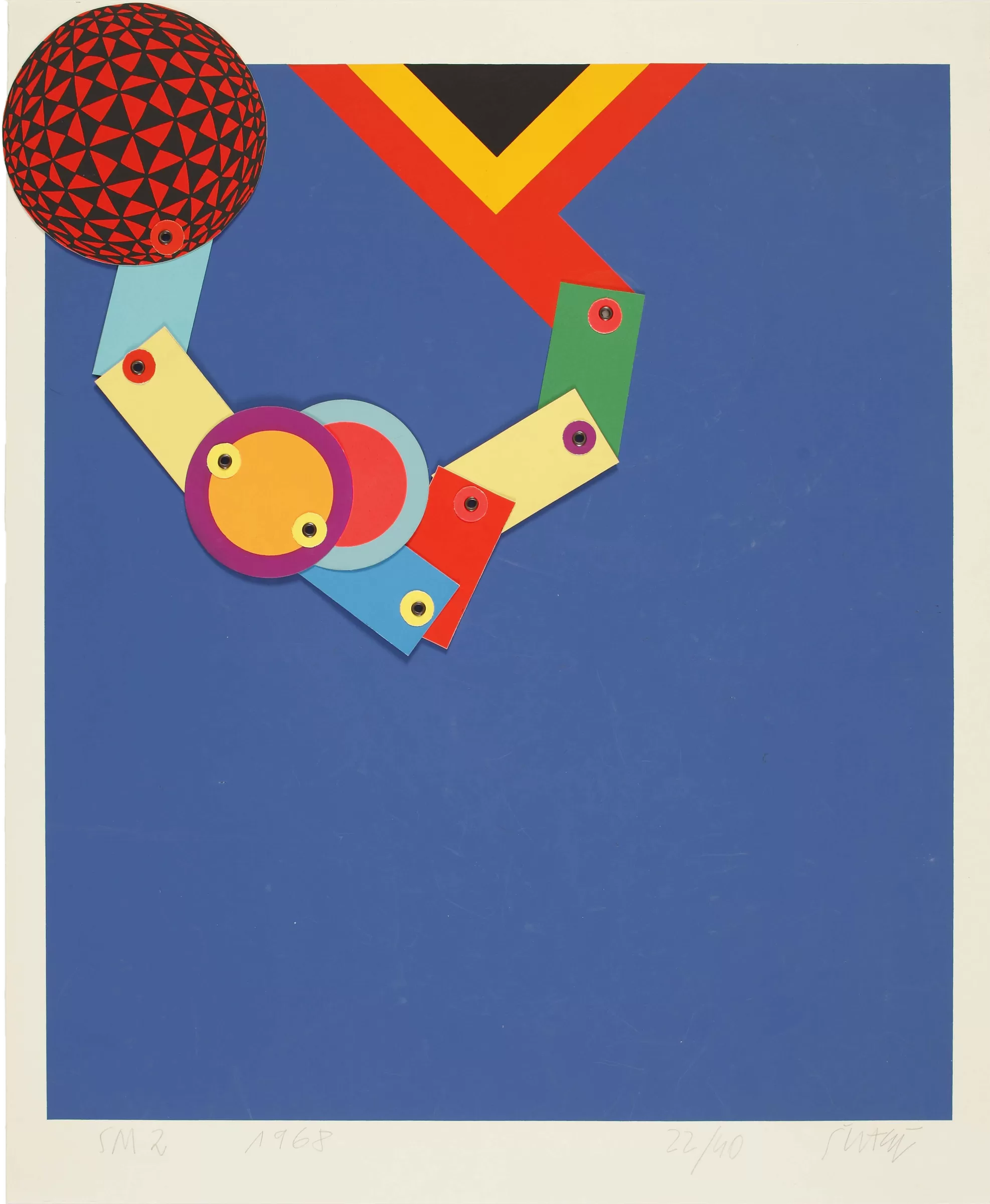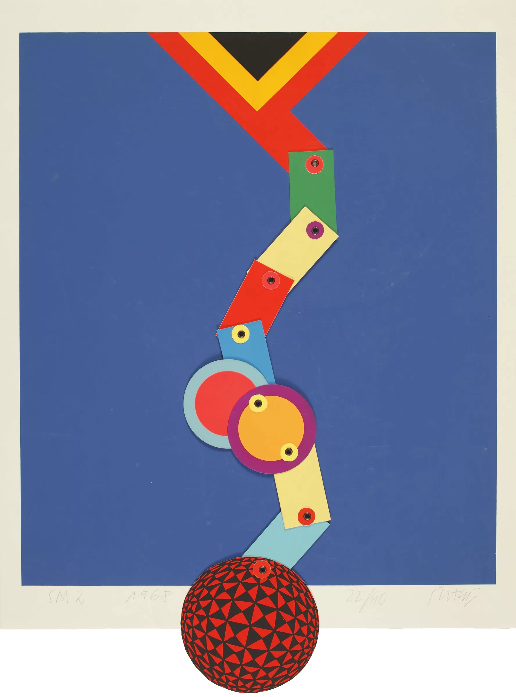 SM 2, 1968. Serigrafije Miroslava Šuteja / Izabrana djela iz fundusa Kabineta grafike HAZU ← SM 1, 1968. SM 3, 1969. → SM 2, 1968.mobilna serigrafija570 × 470 mm (dim. lista)karton; metalne spojnicesignatura na margini ispod otiska, olovkom:d. l.: SM 2 1968 d. d.: 22/40 Šutej vlasništvo HAZU, Kabinet grafikeinv. br. KG HAZU 11833 ← SM 1, 1968. SM 3, 1969. →
